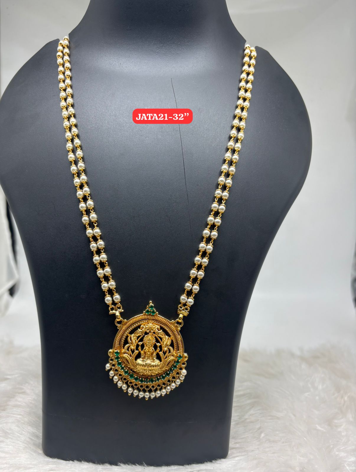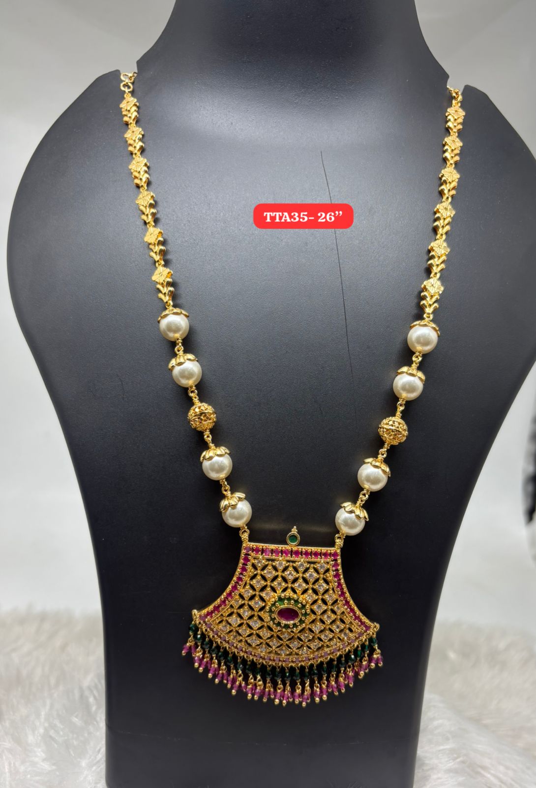 Premium quality one gram gold 26 inch pearl chain with big stone pendent